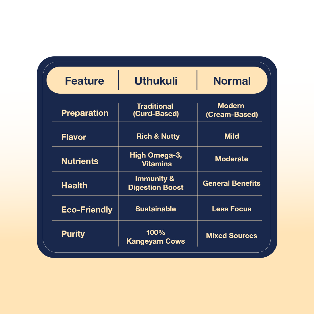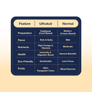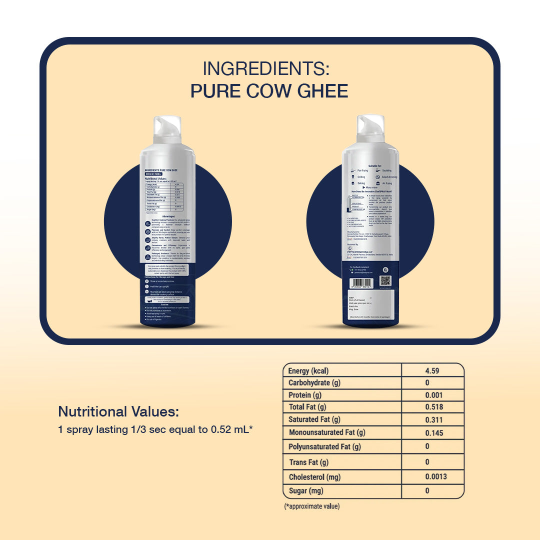 ChefSPRAY Uthukuli Pure Cow Ghee brings the golden richness of traditional ghee to your kitchen in a mess-free spray. With extended shelf life, it stays fresh and ready whenever you need it. Perfect for families who care for gut health, immunity, and overall wellness, it makes cooking, baking, roasting, or garnishing effortless—smart, healthy meals for those who value both taste and well-being.
